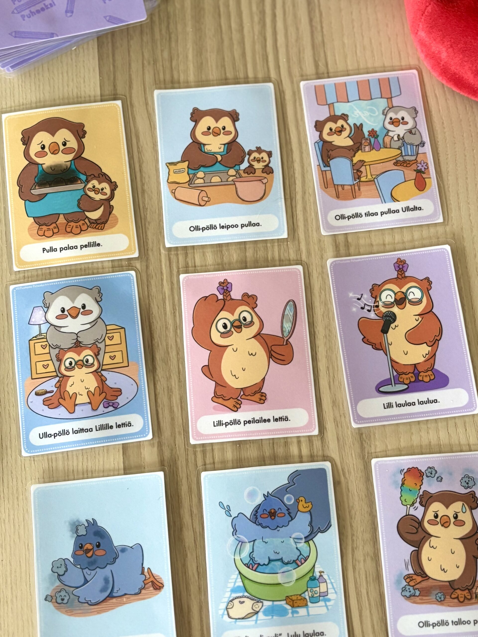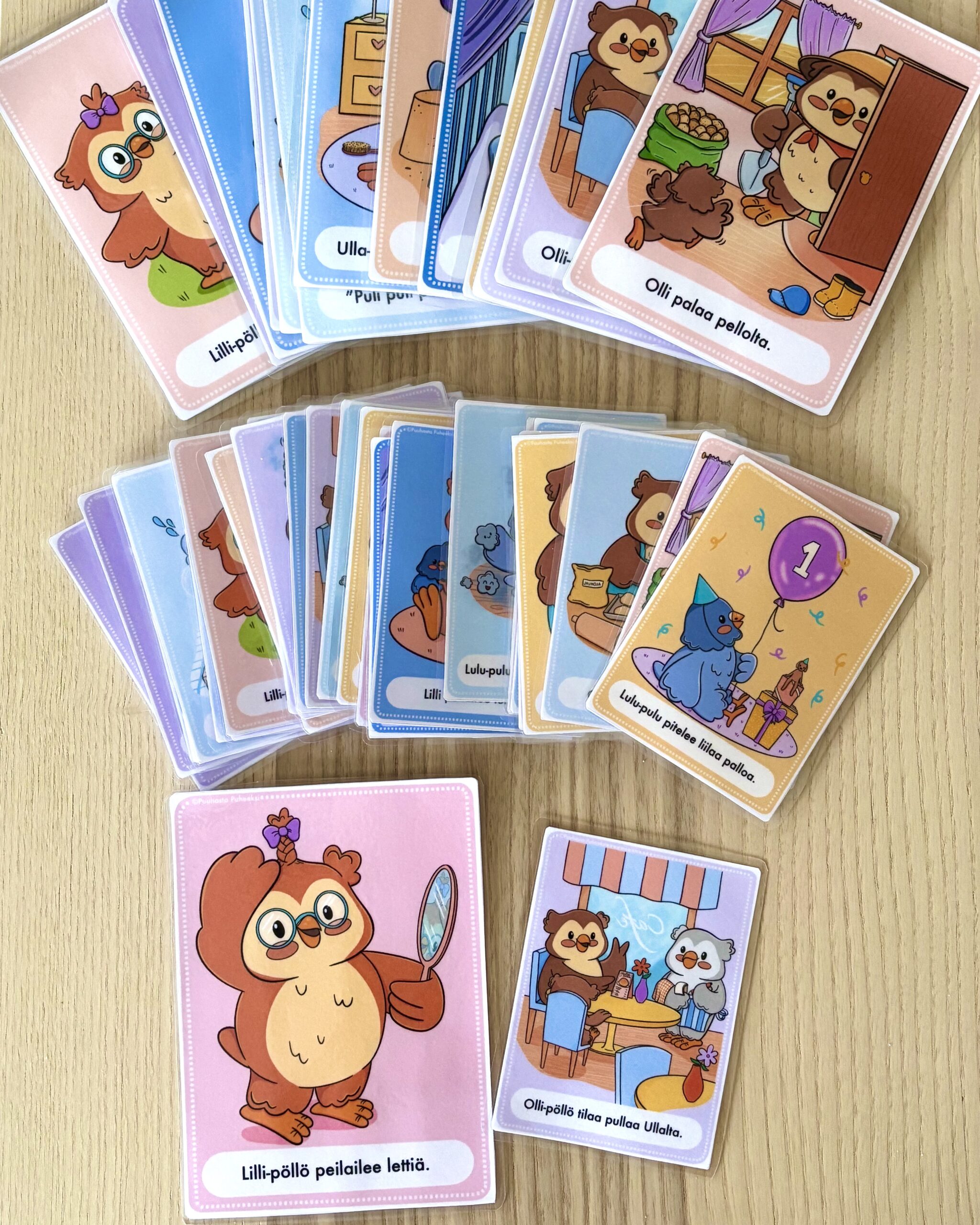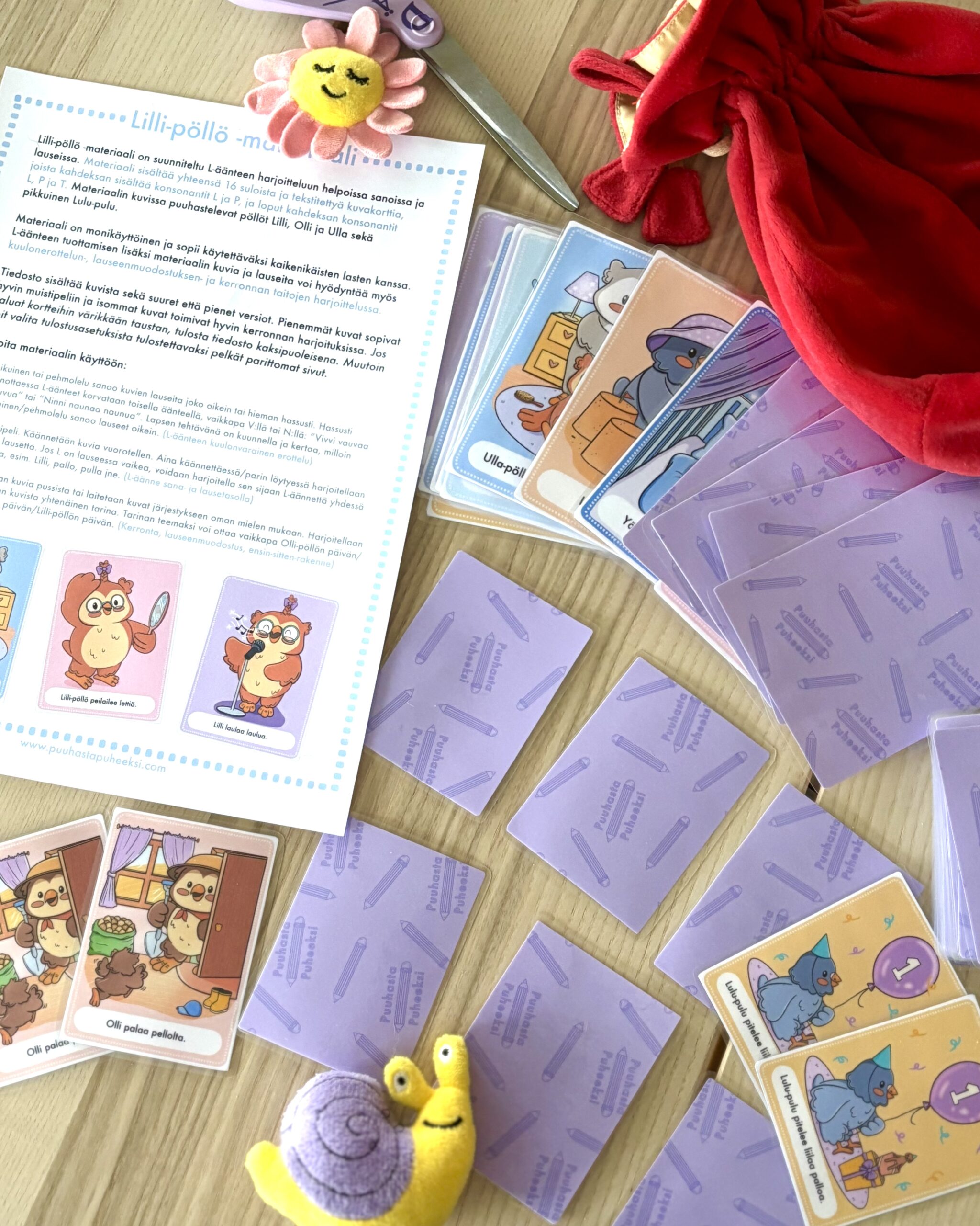 Lilli-pöllö -materiaalissa puuhastelevat pöllöt Lilli, Olli ja Ulla sekä pikkuinen Lulu-Pulu. Materiaaliin kuuluu yhteensä 16 suloista ja tekstitettyä kuvakorttia, joista kahdeksan sisältää konsonantit L ja P ja loput kahdeksan konsonantit L, P ja T. Lilli-pöllö sopiikin erityisesti L-äänteen harjoitteluun helpoissa sanoissa ja lauseissa. Monipuolisten kuvien johdosta materiaali sopii loistavasti myös kuulonerottelun, lauseenmuodostuksen ja kerronnan taitojen harjoitteluun.