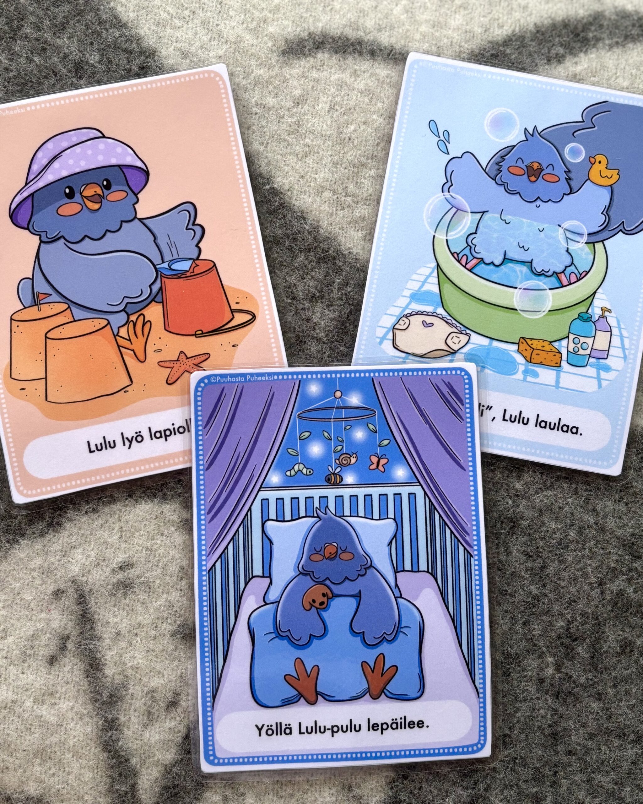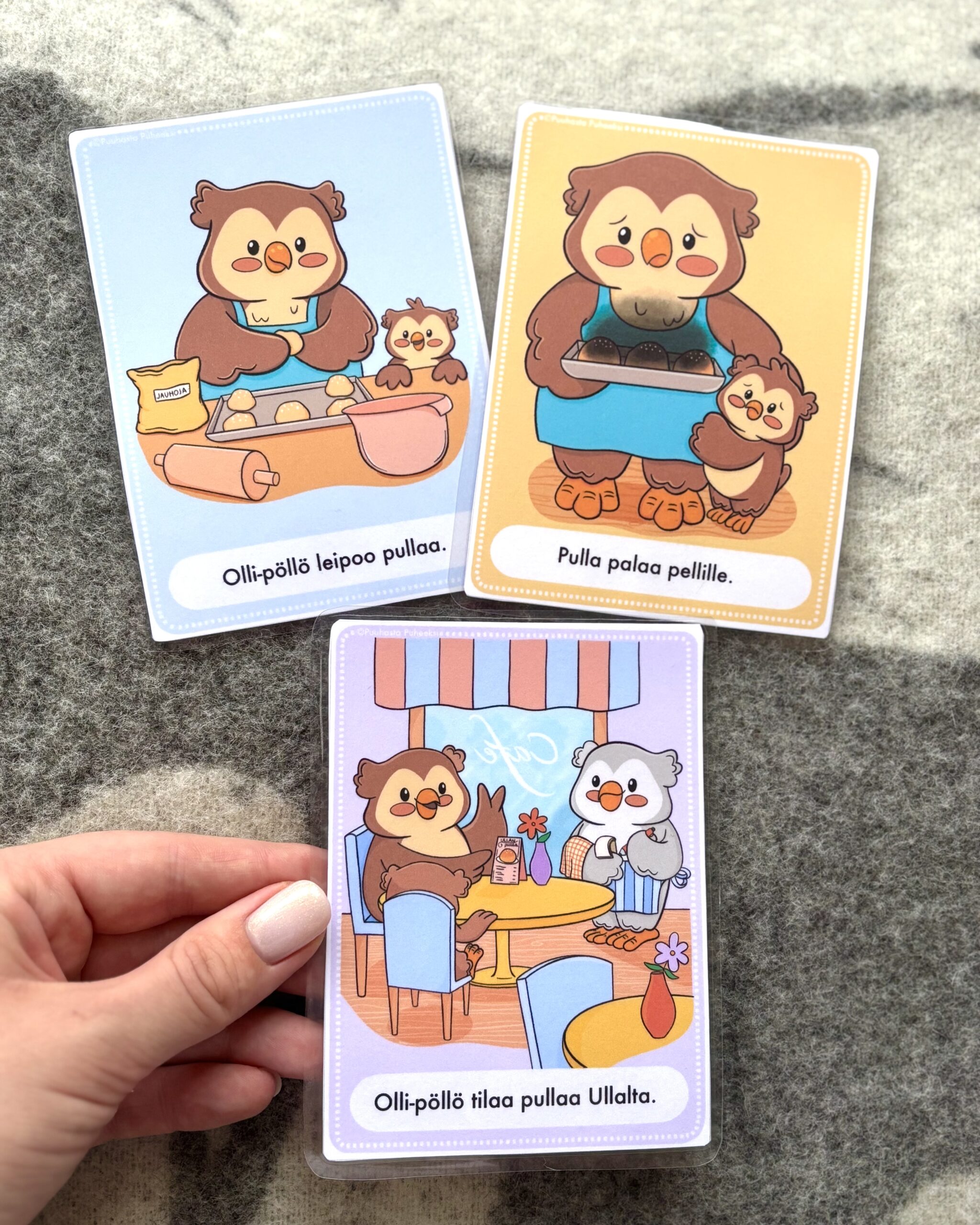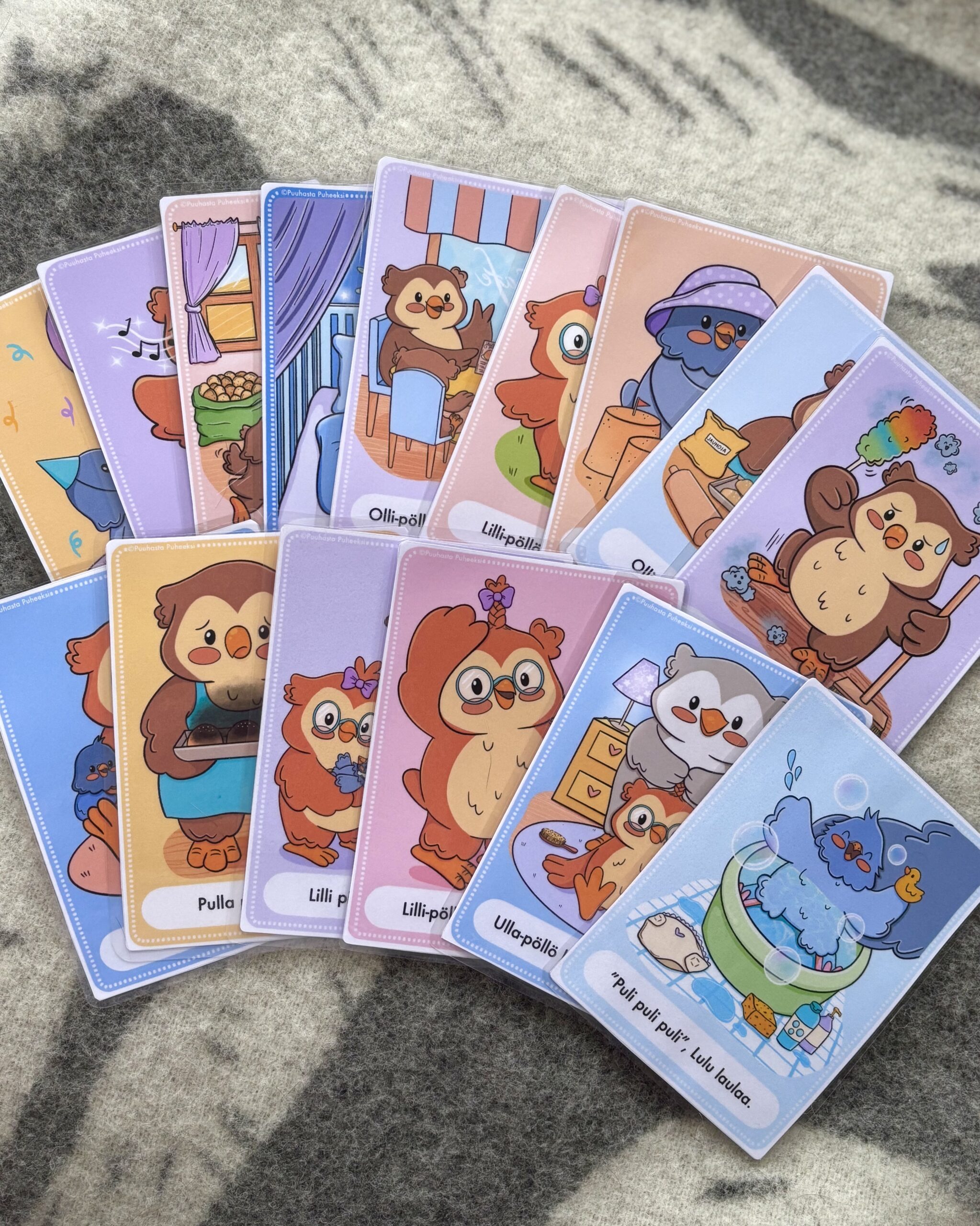 Lilli-pöllö -materiaalissa puuhastelevat pöllöt Lilli, Olli ja Ulla sekä pikkuinen Lulu-Pulu. Materiaaliin kuuluu yhteensä 16 suloista ja tekstitettyä kuvakorttia, joista kahdeksan sisältää konsonantit L ja P ja loput kahdeksan konsonantit L, P ja T. Lilli-pöllö sopiikin erityisesti L-äänteen harjoitteluun helpoissa sanoissa ja lauseissa. Monipuolisten kuvien johdosta materiaali sopii loistavasti myös kuulonerottelun, lauseenmuodostuksen ja kerronnan taitojen harjoitteluun.