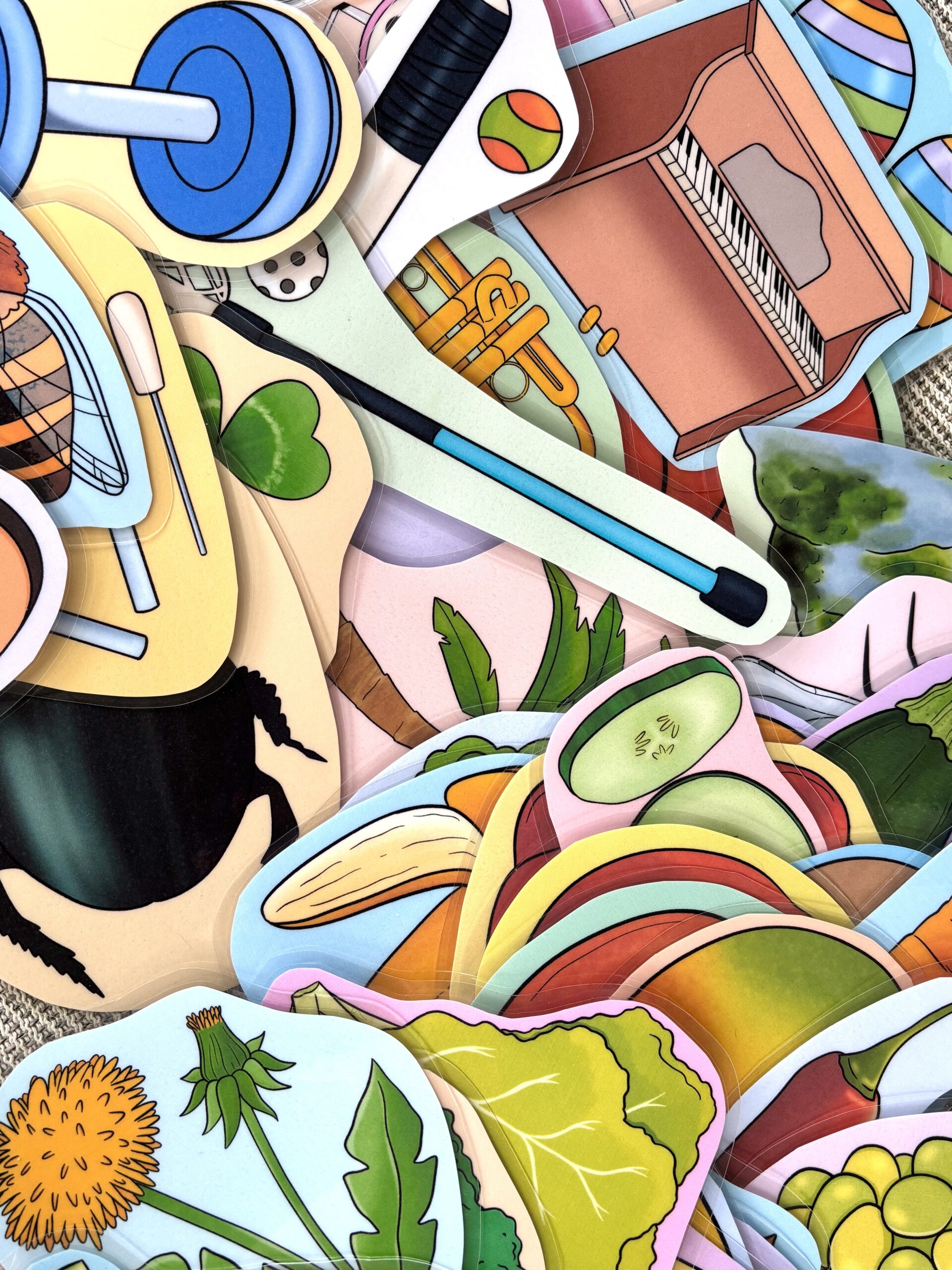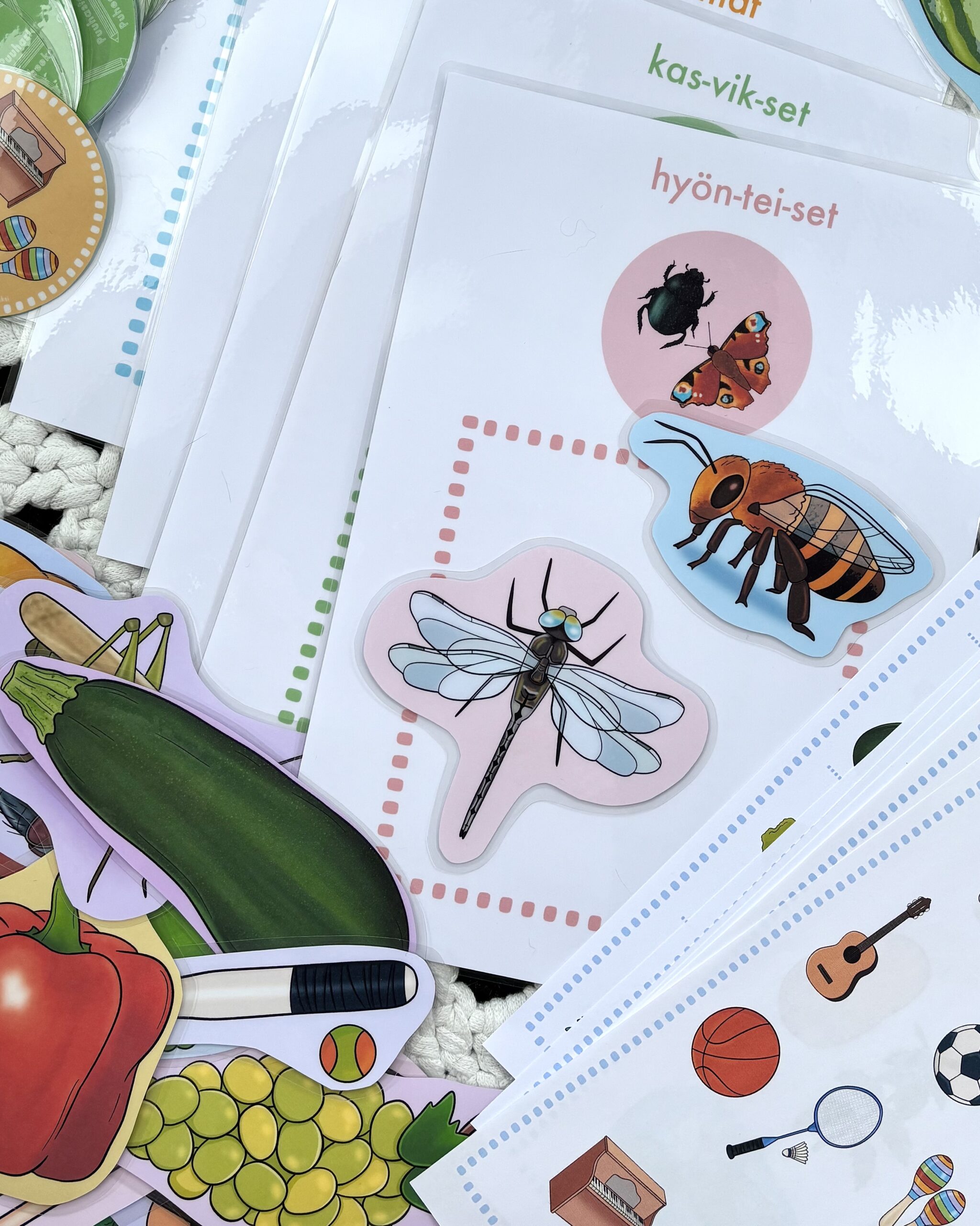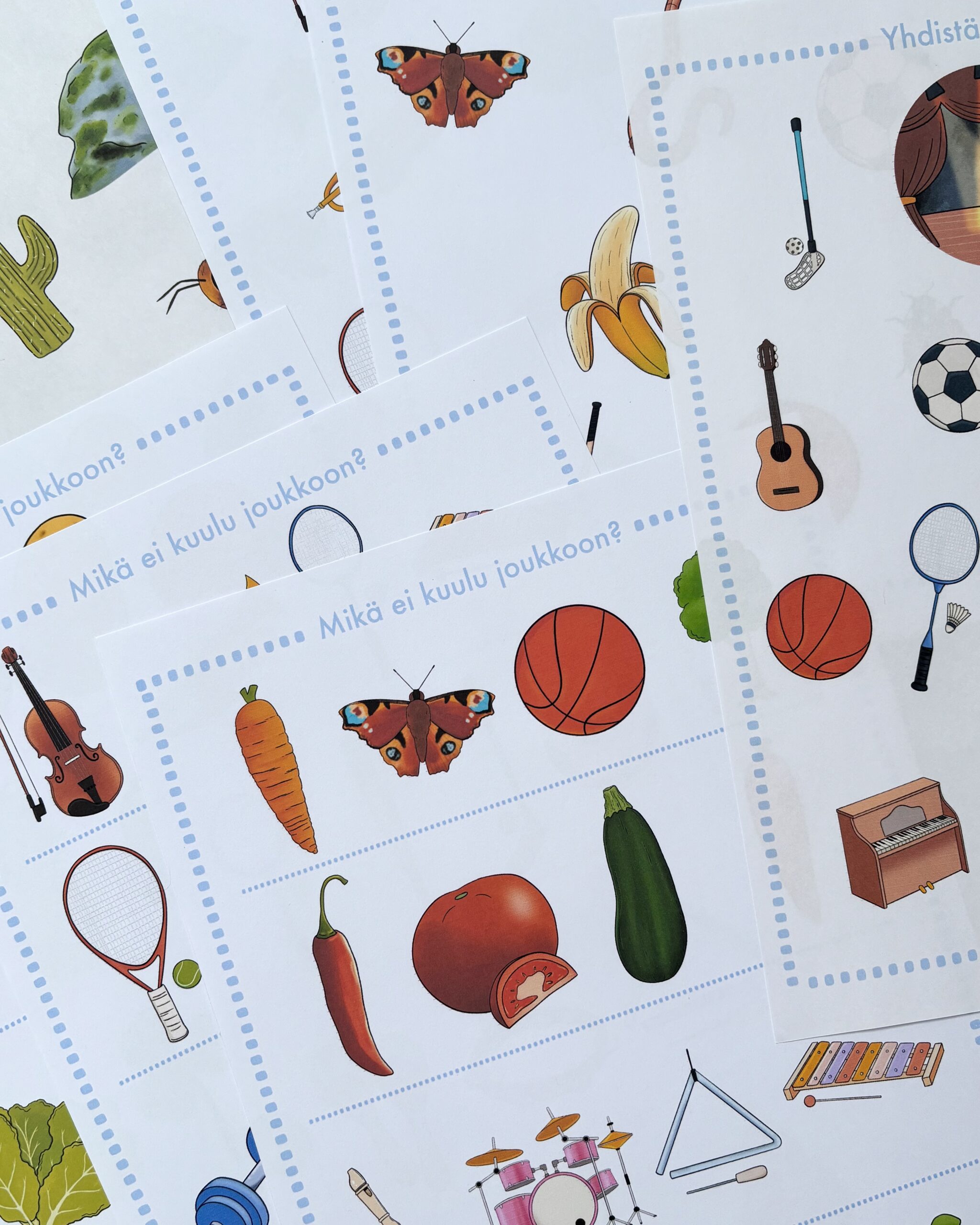 Materiaali on PDF-tiedosto (35 sivua) ja sisältää: Yläkäsitepohjat sekä 59 kuvaa kuudesta eri yläkategoriasta, seitsemän erilaista kynätehtäväsivua sekä pelikortit yläkäsitepeliin/muistipeliin.