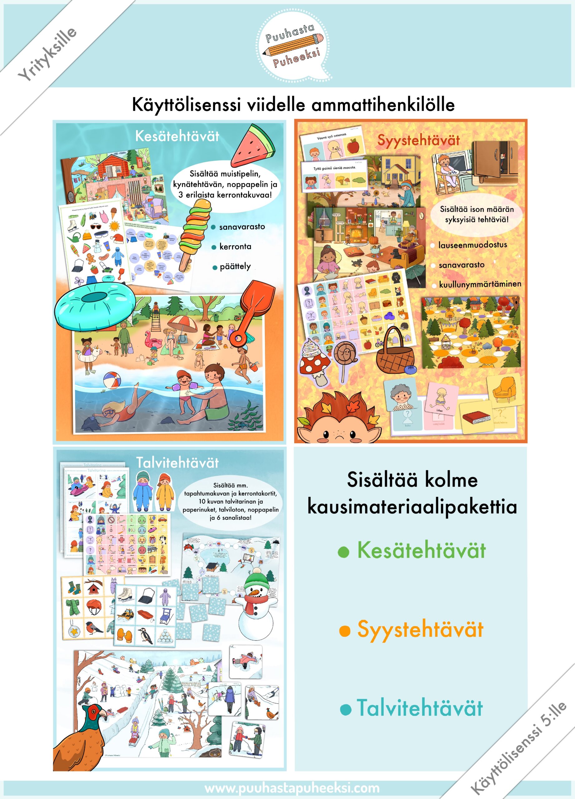 Yksi käyttölisenssi sisältää käyttöoikeuden max. 5:lle ammattihenkilölle seuraaviin materiaaleihin: Kesätehtävät, Syystehtävät ja Talvitehtävät.